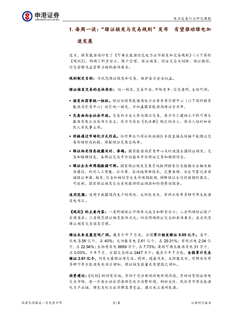 申港证券:电力设备行业研究周报:“绿证核发与交易规则”发布,有望推动绿电加速发展.pdf