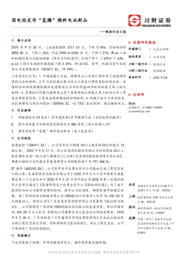 川财证券:制造行业日报:国电投发布“氢腾”燃料电池新品.pdf