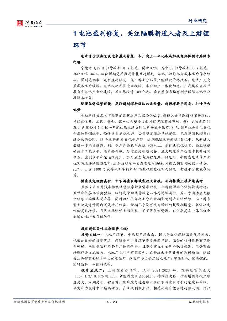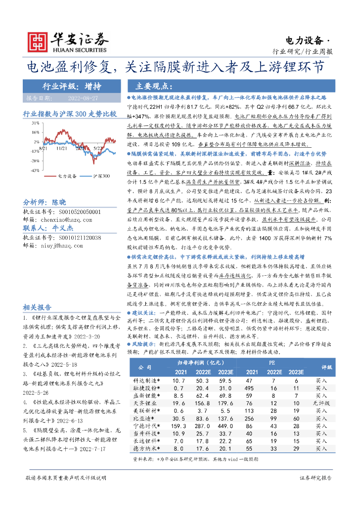 华安证券:电力设备行业周报:电池盈利修复,关注隔膜新进入者及上游锂环节.pdf