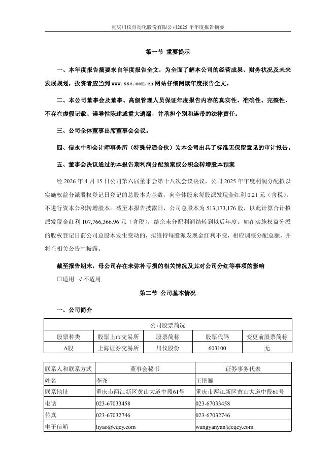 603100-川仪股份:川仪股份2025年年度报告摘要.pdf