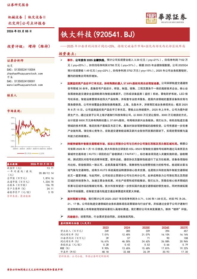 华源证券:铁大科技(920541)-2025年归母净利润预计同比+25%,持续突破海外市场+强化西部及西北部区域布局.pdf