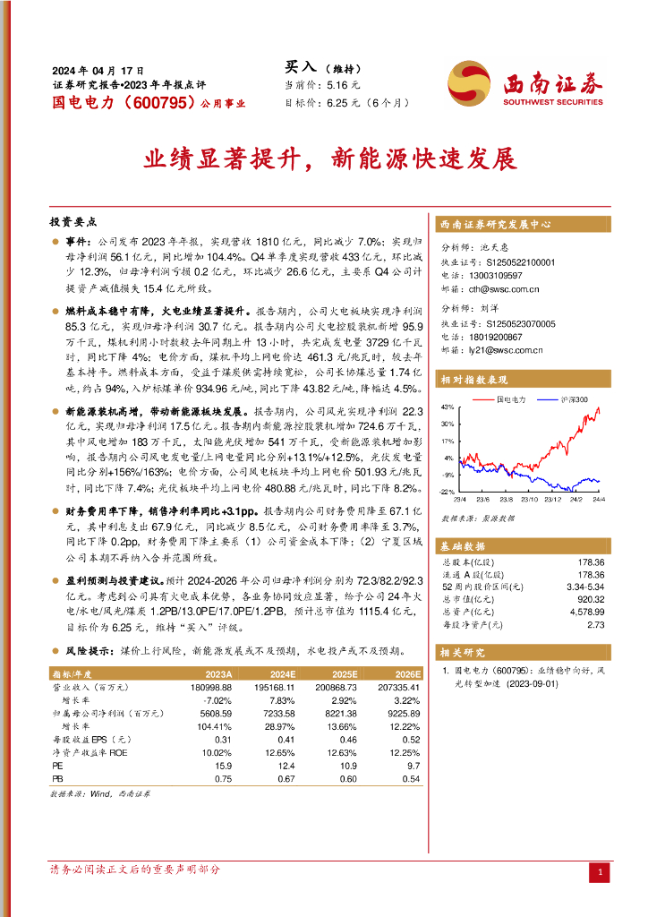 西南证券:国电电力(600795)-业绩显著提升,新能源快速发展.pdf