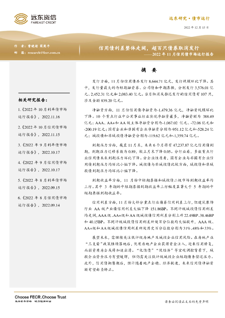 远东资信:2022年11月信用债市场运行报告:信用债利差整体走阔,超百只债券取消发行.pdf
