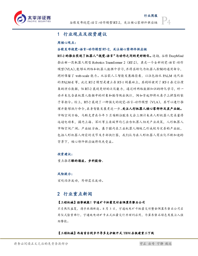 太平洋证券:机械设备行业周报:谷歌发布视觉-语言-动作模型RT-2,关注核心零部件供应链.pdf