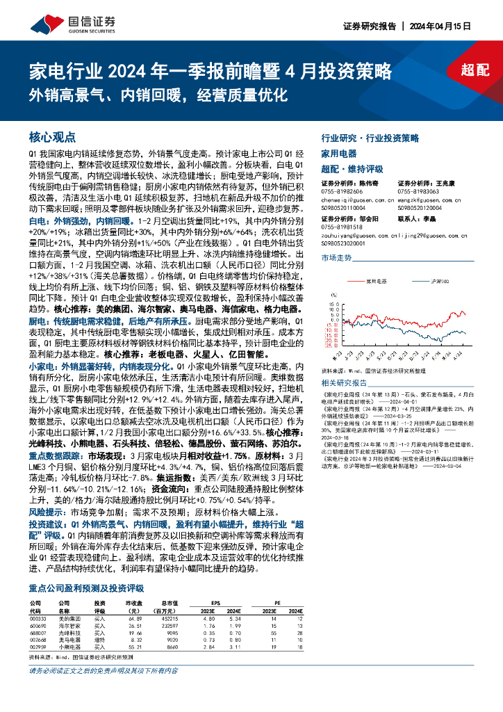国信证券:家电行业2024年一季报前瞻暨4月投资策略:外销高景气、内销回暖,经营质量优化.pdf
