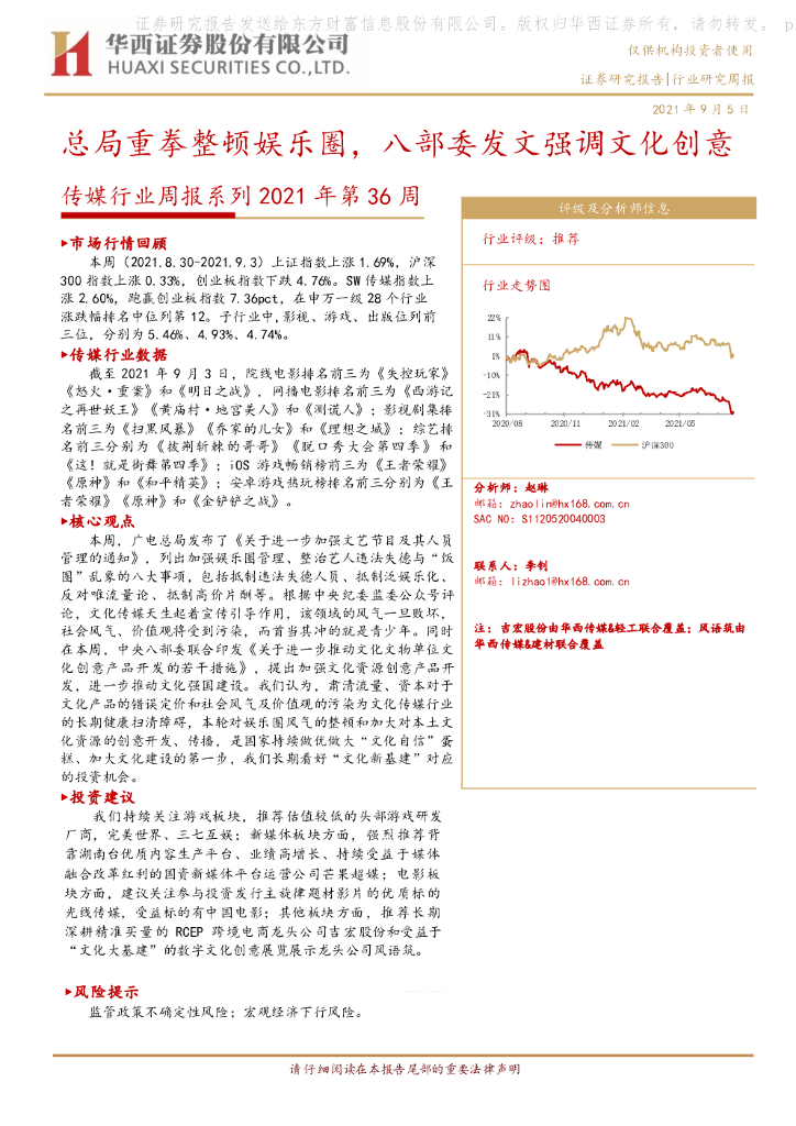华西证券:传媒行业周报系列2021年第36周:总局重拳整顿娱乐圈,八部委发文强调文化创意.pdf