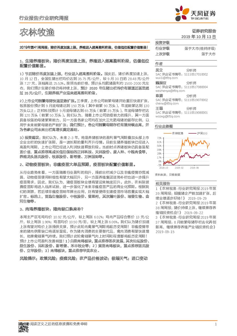 天风证券:农林牧渔2019年第41周周报:猪价再度加速上涨,养殖进入超高盈利阶段,估值低位配置价值彰显!.pdf