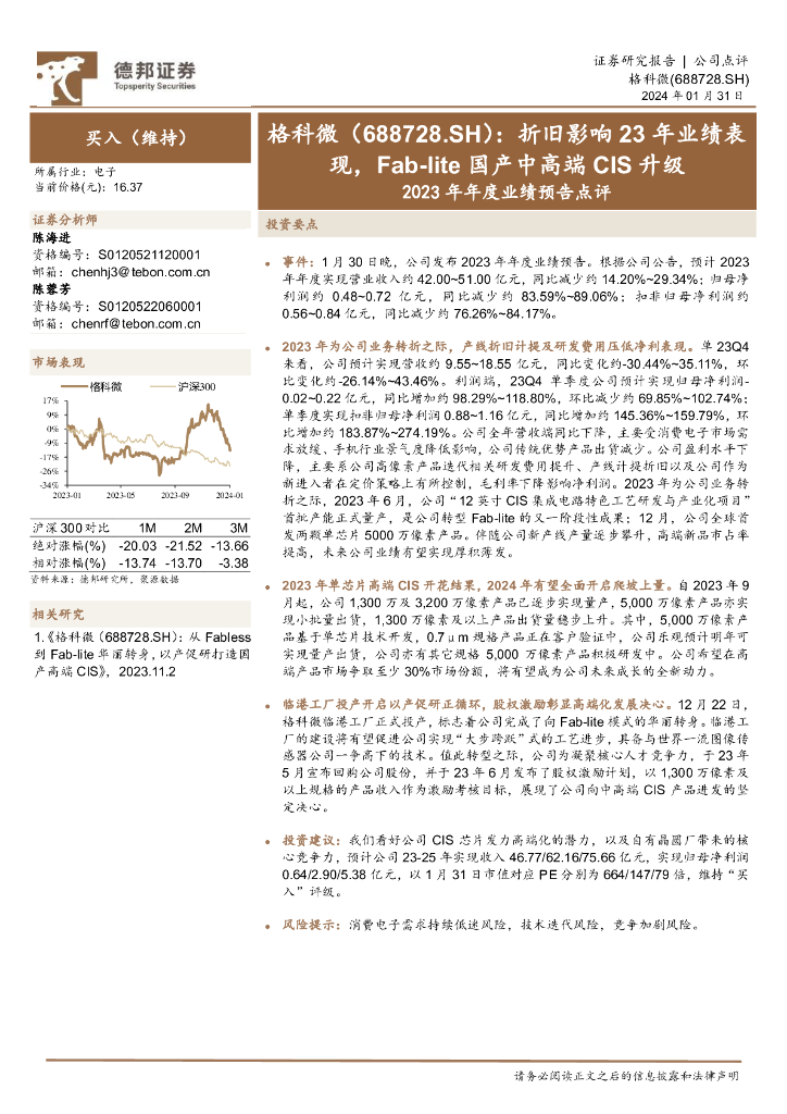 德邦证券:格科微(688728)-2023年年度业绩预告点评:折旧影响23年业绩表现,Fab-lite国产中高端CIS升级.pdf