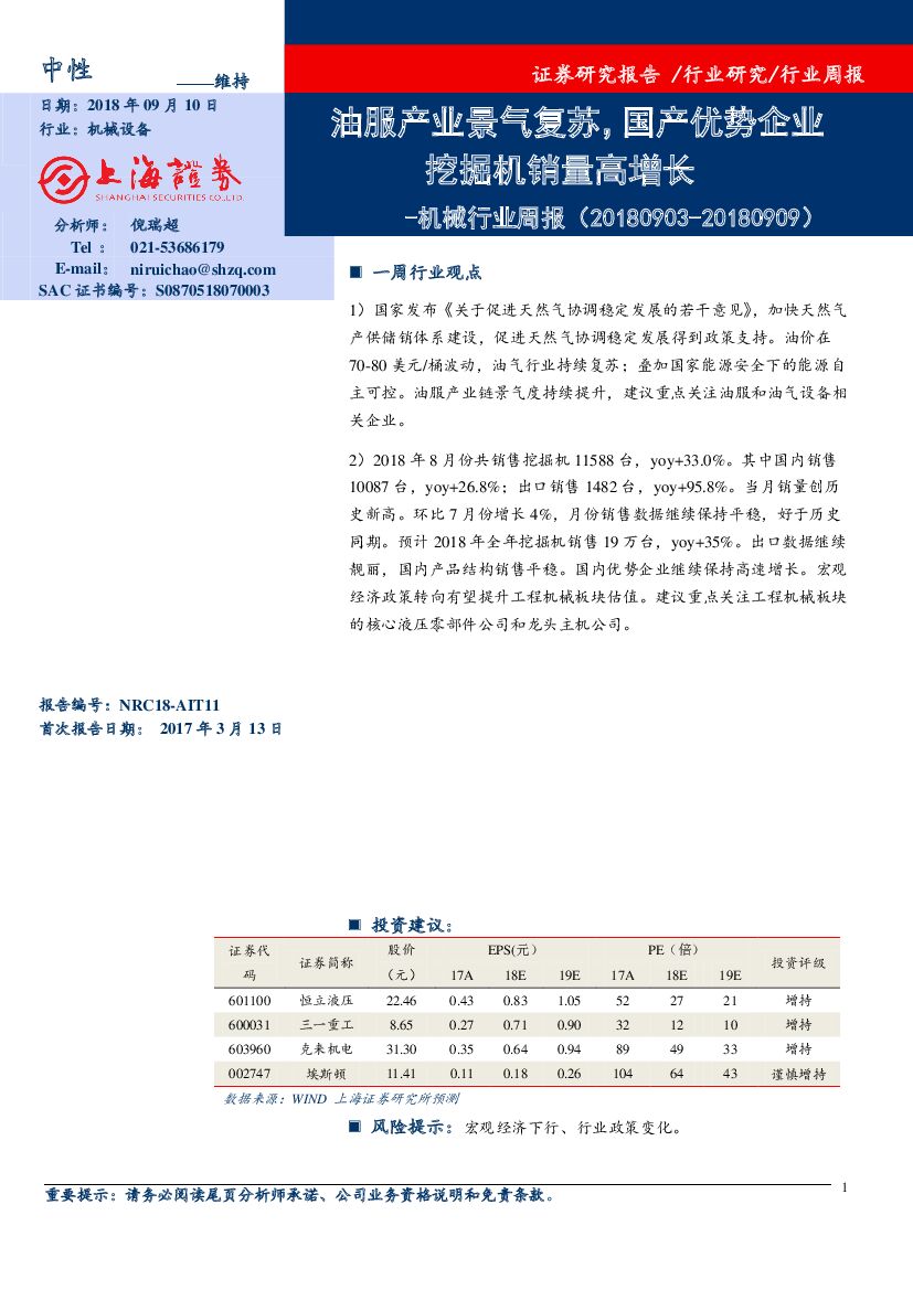 上海证券:机械行业周报:油服产业景气复苏,国产优势企业挖掘机销量高增长.pdf