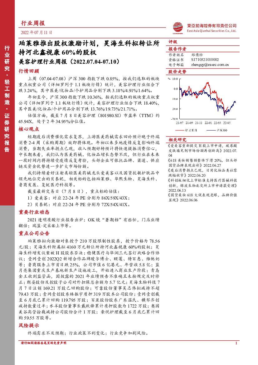东亚前海证券:美容护理行业周报:珀莱雅推出股权激励计划,昊海生科拟转让所持河北鑫视康60%的股权.pdf