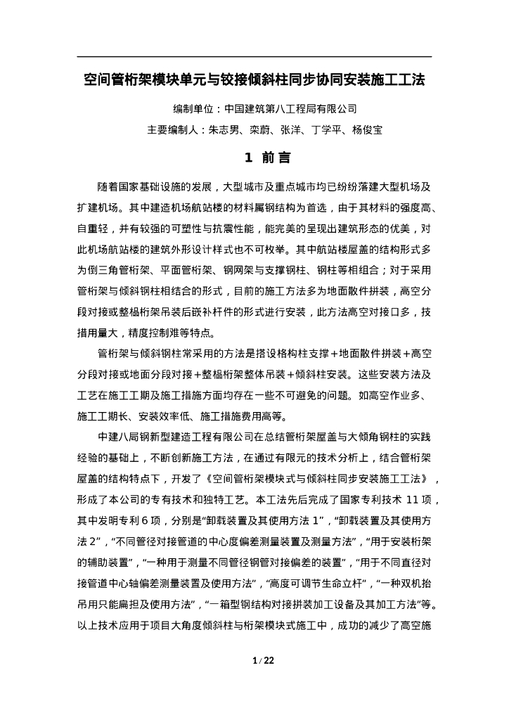 QHGF-2022048 空间管桁架模块单元与铰接倾斜柱同步协同安装施工工法.doc