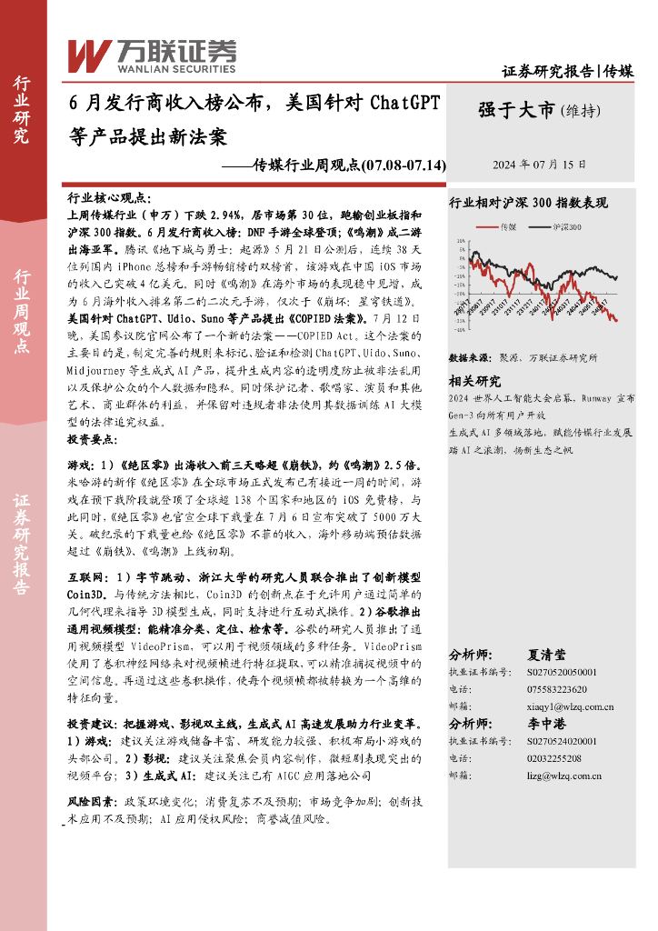 万联证券:传媒行业周观点:6月发行商收入榜公布,美国针对ChatGPT等产品提出新法案.pdf