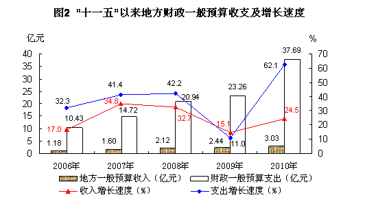 财政:全年全州财政收入5.42亿元,比上年增长36.0%。其中:地方一般预算收入3.03亿元,增长24.5%。实现增值税0.28亿元,企业所得税0.13亿元,个人所得税0.08亿元,分别比上年增长19.9%、152.7%和12.9%。全年财政一般预算支出37.69亿元,增长62.1%。其中:社会保障与就业支出5.73亿元,增长29.7%;教育支出7.20亿元,增长44.6%;医疗卫生支出3.37亿元,增长41.3%;环境保护支出2.31亿元,增长43.4%;农林水事物支出5.26亿元,增长58.4%;文化体育与传媒支出0.86亿元,增长1.7倍;科学技术支出0.09亿元,增长98.2%;城乡社区事务支出2.05亿元,增长1.1倍;一般公共服务支出3.93亿元,增长31.9%。