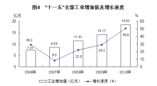 全年全州全部工业增加值18.53亿元,比上年增长50.6%。规模以上工业增加值17.45亿元,比上年增长53.6%。从经济类型看:国有企业增长81%,非国有企业增长32.8%。从轻重工业看:轻工业增长33.8%,重工业增长64.2%。规模以上工业企业产品销售率为96.8%,提高2.3个百分点。主要产品产量保持增长。