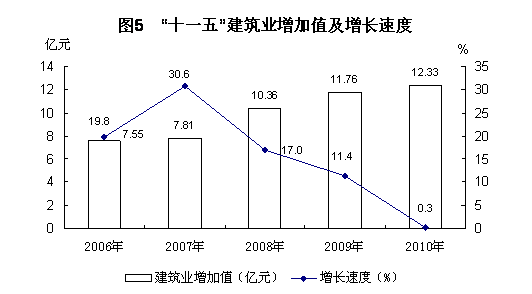 全年全社会建筑业增加值12.33亿元,比上年增长0.3%。具有资质等级的总承包和专业承包建筑企业10个,利润总额794万元,比上年增长1.5倍。