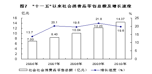 全年全社会消费品零售总额14.37亿元,比上年增长19.6%。按销售地区分:城镇消费品零售额9.05亿元,增长18.2%;农村消费品零售额5.32亿元,增长22.1%。按行业分:批发业消费品零售额1.74亿元,增长12.4%;零售业9.72亿元,增长18.6%;住宿和餐饮业2.91亿元,增长28.2%。