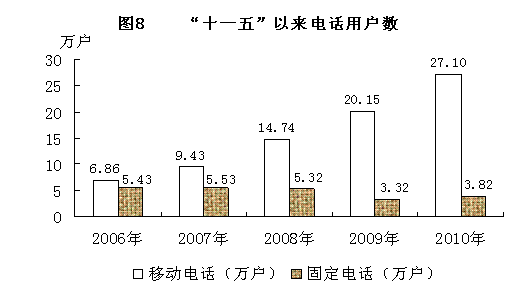 全年邮电业务总量达1.22亿元,比上年增长10.7%。其中:邮政业务量0.11亿元,增长13.9%;电信业务量1.11亿元,增长10.4%。年末移动电话用户27.10万户,比上年末增长34.5%;固定电话用户3.82万户,比上年末增长15.1%。其中:农村固定电话用户1.59万户,下降5.4%。年末全州国定和移动电话总数达30.92万户,比上年末增加7.45万户,电话普及率68部/百人。