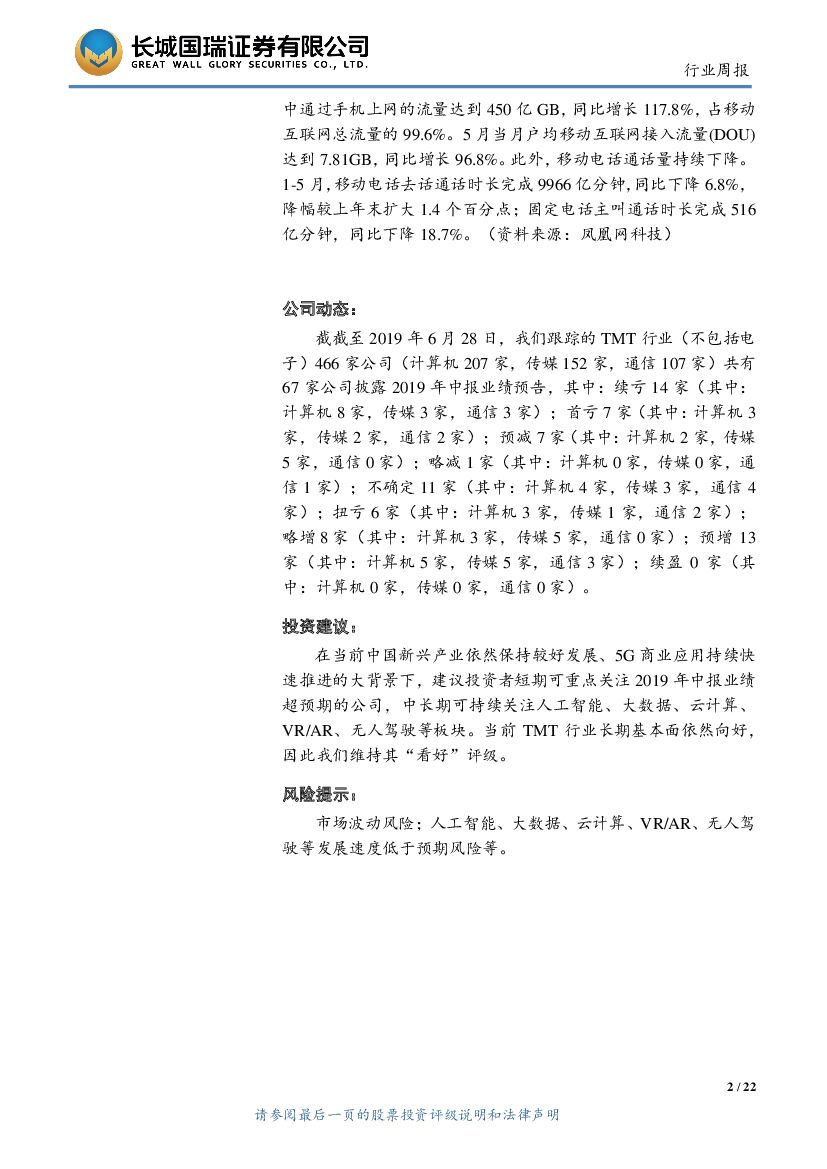 长城国瑞证券:TMT行业双周报2019年第13期(总第72期):微软预测2030年AI将为全球GDP增长贡献5.2万亿美元,5月人均手机流量同比增长96.8%.pdf