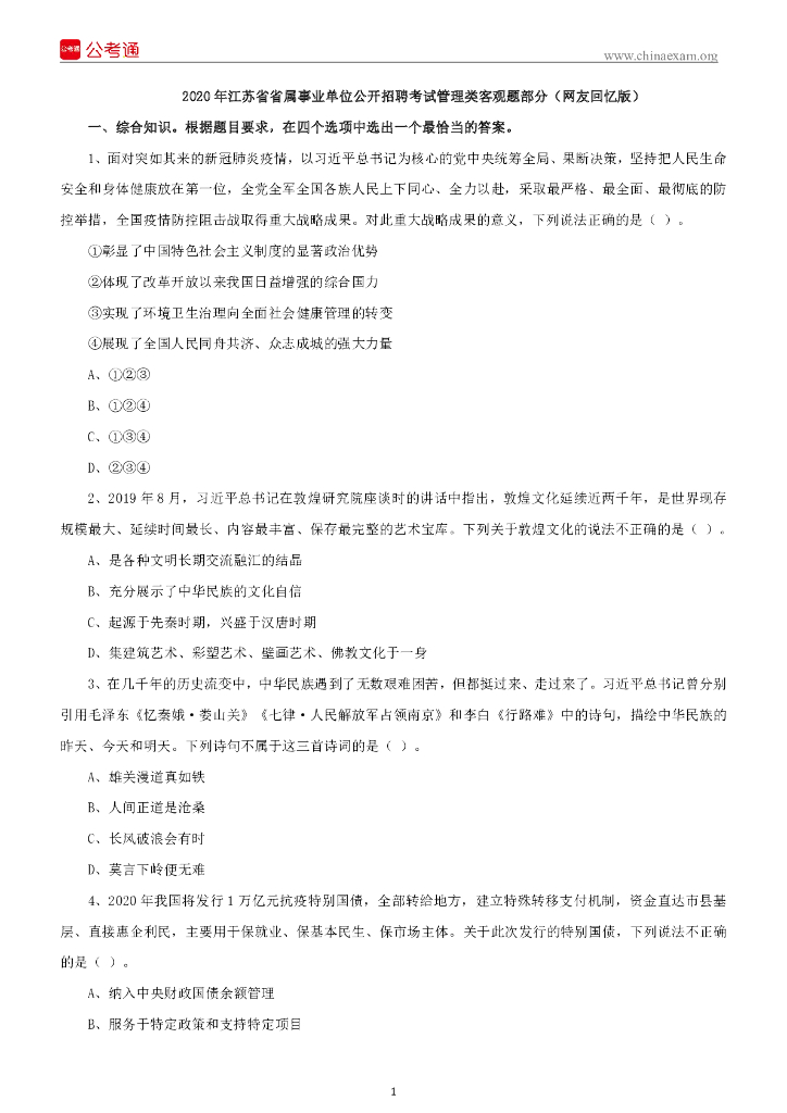 2020年江苏省属事业单位招聘考试管理类客观题部分(网友回忆版).pdf