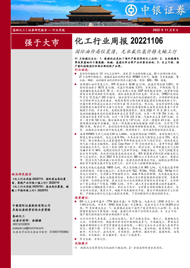 中银证券:化工行业周报:国际油价高位震荡,无水氟化氢价格大幅上行.pdf