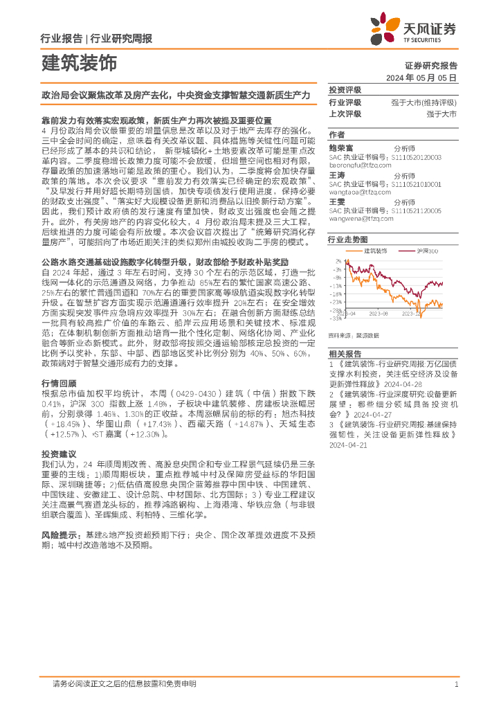 天风证券:建筑装饰行业研究周报:政治局会议聚焦改革及房产去化,中央资金支撑智慧交通新质生产力.pdf