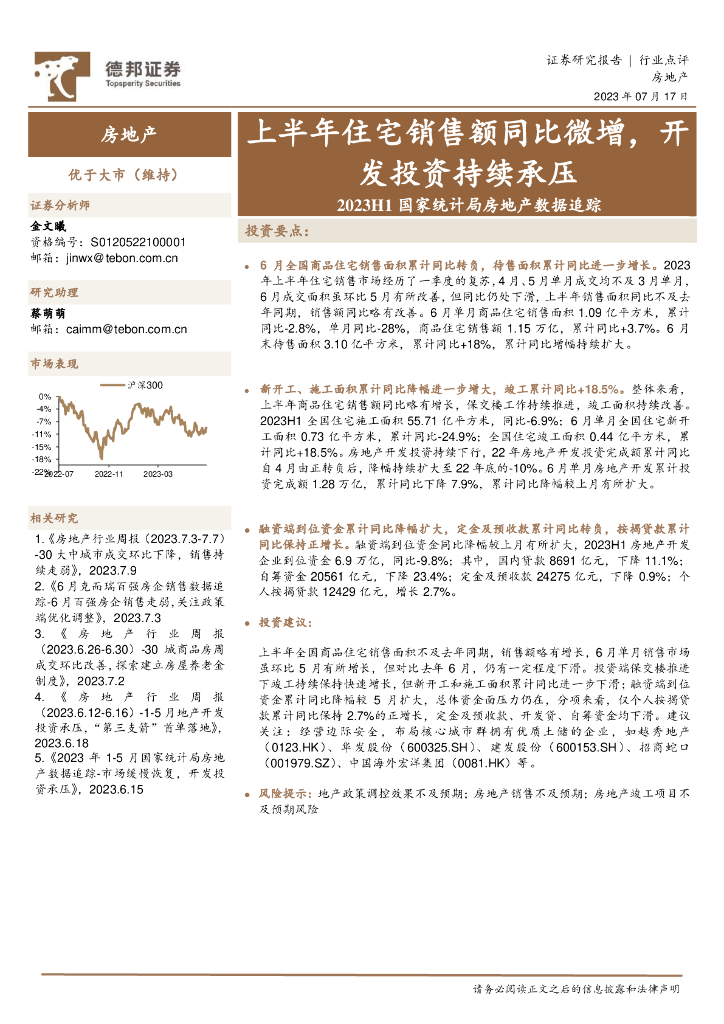 德邦证券:2023H1国家统计局房地产数据追踪:上半年住宅销售额同比微增,开发投资持续承压.pdf