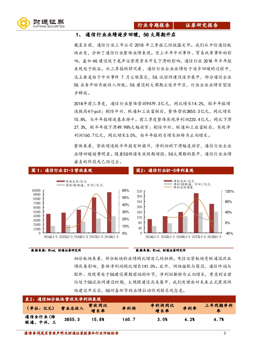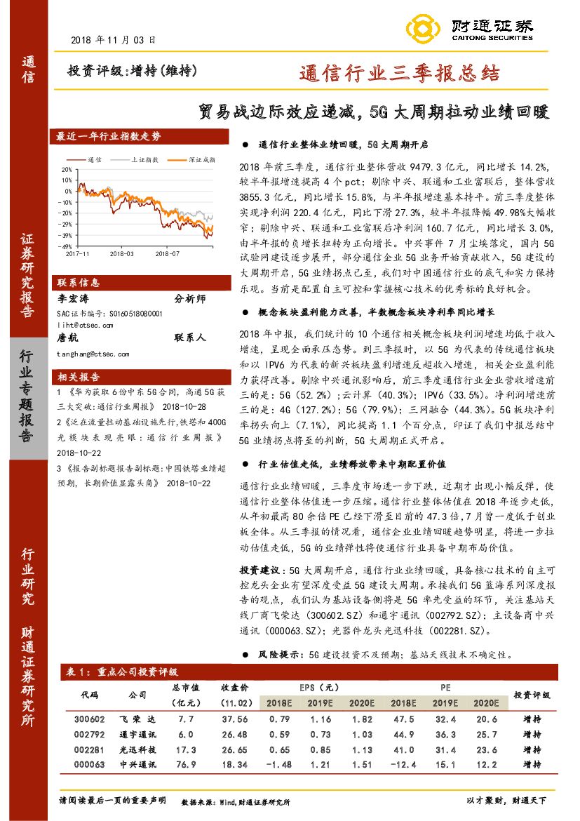 财通证券:通信行业三季报总结:贸易战边际效应递减,5G大周期拉动业绩回暖.pdf