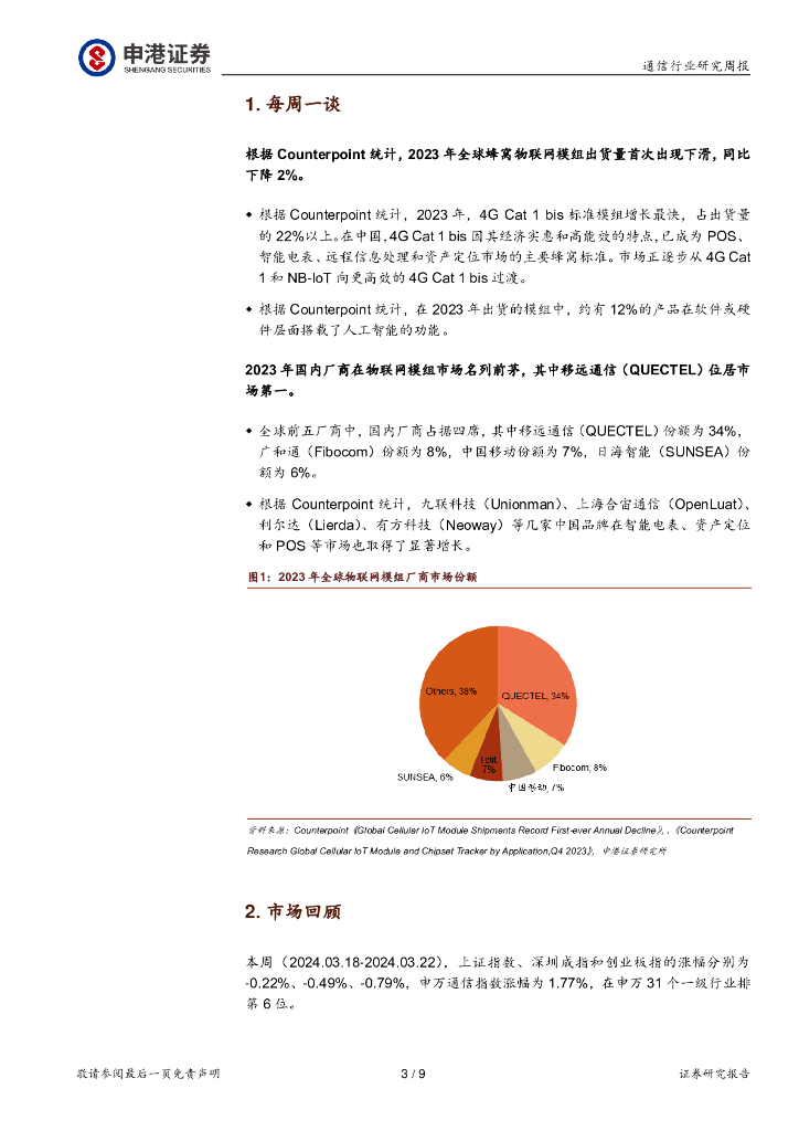 申港证券:通信行业研究周报:全球蜂窝物联网模组市场首次下滑.pdf