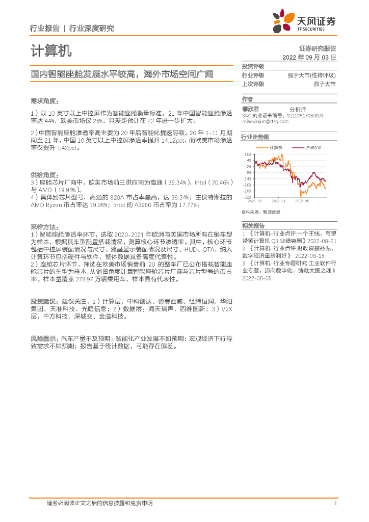 天风证券:计算机行业深度研究:国内智能座舱发展水平较高,海外市场空间广阔.pdf