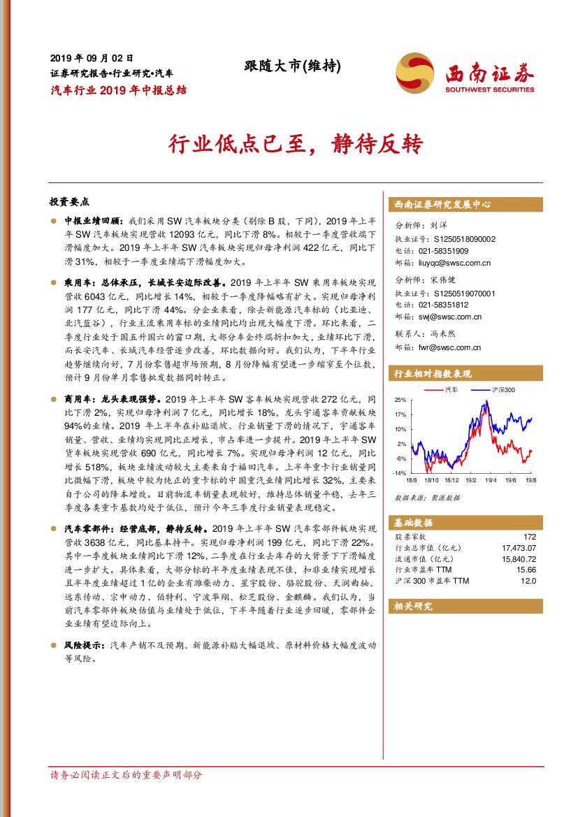 西南证券:汽车行业2019年中报总结:行业低点已至,静待反转.pdf