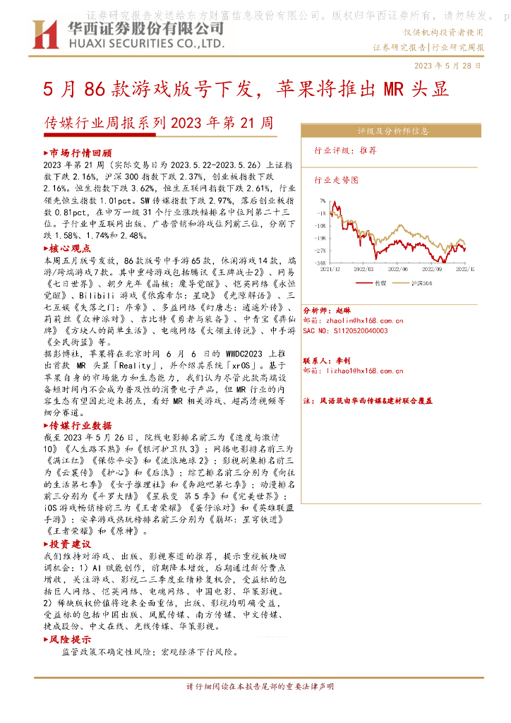 华西证券:传媒行业周报系列2023年第21周:5月86款游戏版号下发,苹果将推出MR头显.pdf