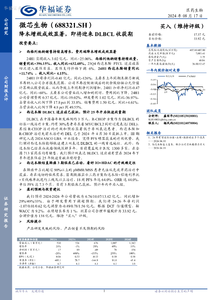 华福证券:微芯生物(688321)-降本增效成效显著,即将迎来DLBCL收获期.pdf