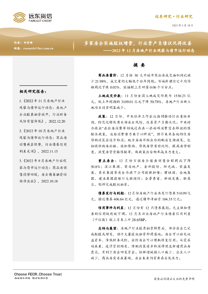 远东资信:多家房企实施股权增资,行业资产负债状况将改善——2022年12月房地产行业观察与债市运行动态.pdf