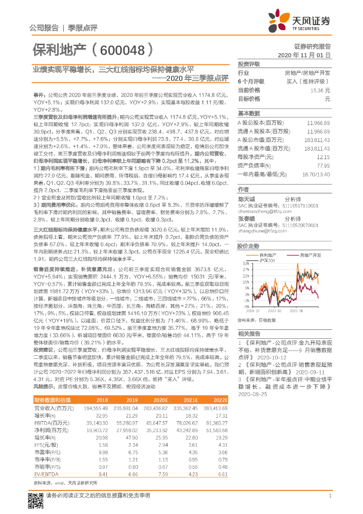 天风证券:保利地产(600048)-2020年三季报点评:业绩实现平稳增长,三大红线指标均保持健康水平.pdf