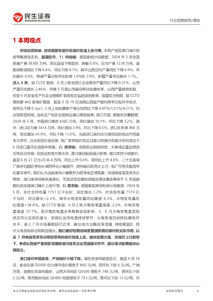 民生证券:煤炭周报:供给延续收缩,迎峰度夏有望开启煤价加速上涨行情.pdf