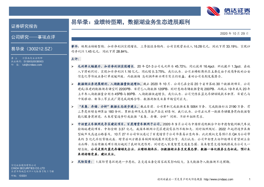 信达证券:易华录:业绩转型期,数据湖业务生态进展顺利.pdf