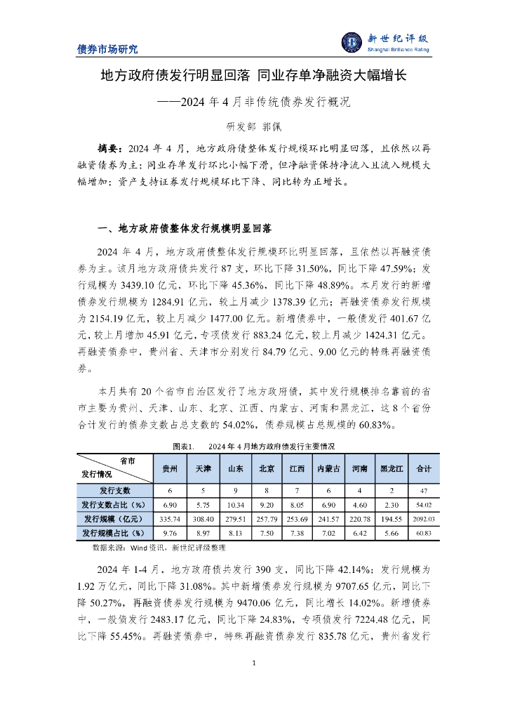 新世纪评级:地方政府债发行明显回落 同业存单净融资大幅增长——2024年4月非传统债券发行概况报告.pdf