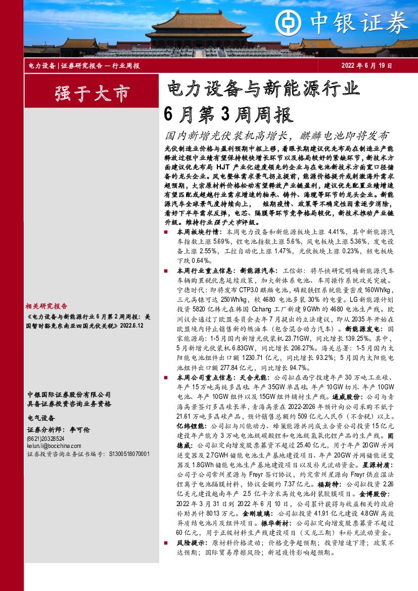 中银证券:电力设备与新能源行业6月第3周周报:国内新增光伏装机高增长,麒麟电池即将发布.pdf