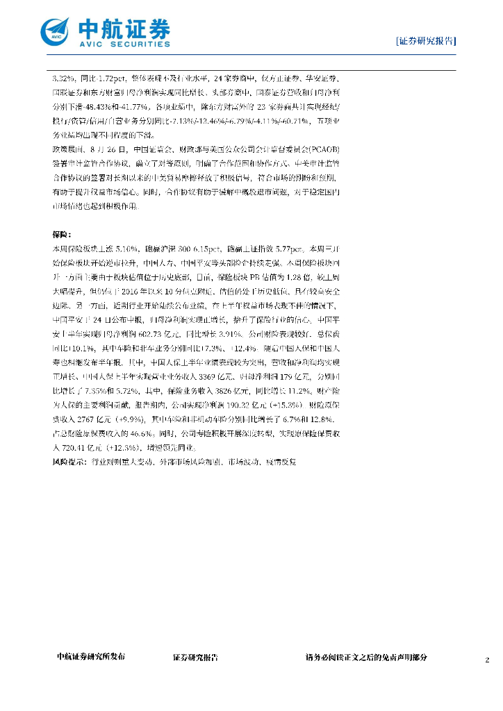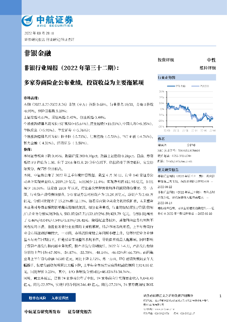 中航证券:非银行业周报(2022年第三十二期):多家券商险企公布业绩,投资收益为主要拖累项.pdf