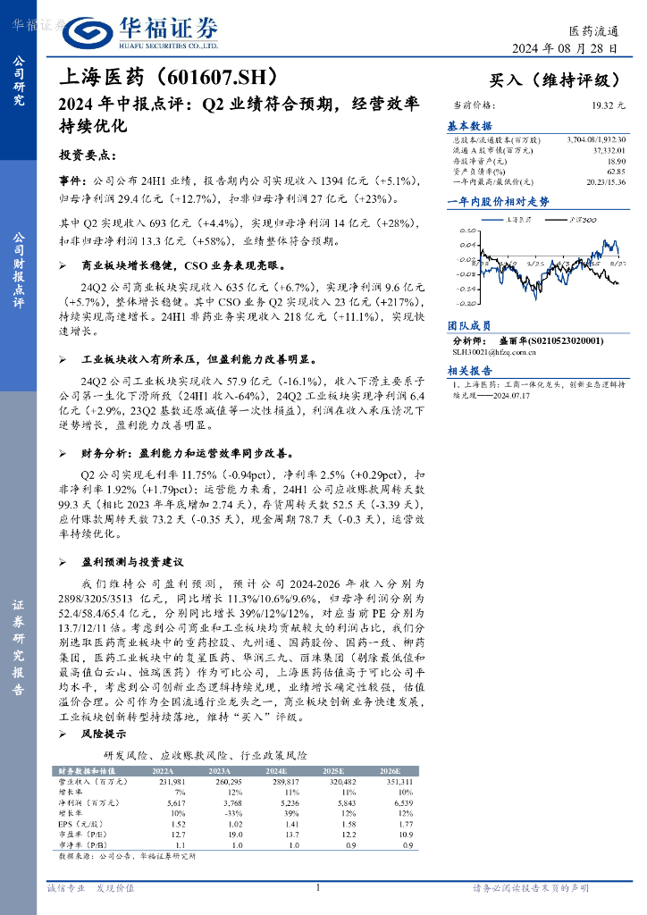 华福证券:上海医药(601607)-2024年中报点评:Q2业绩符合预期,经营效率持续优化.pdf