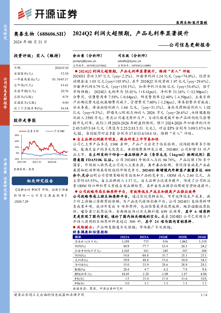 开源证券:奥泰生物(688606)-公司信息更新报告:2024Q2利润大超预期,产品毛利率显著提升.pdf