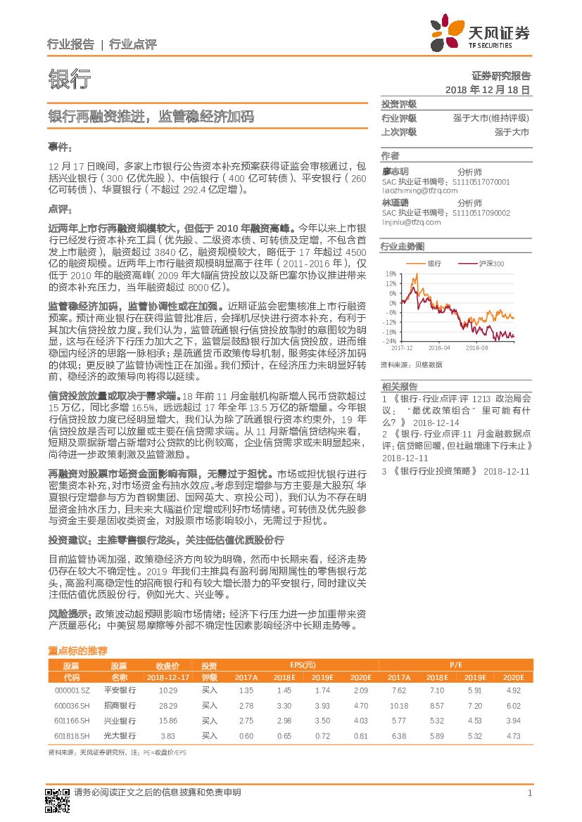 天风证券:银行行业点评:银行再融资推进,监管稳经济加码.pdf