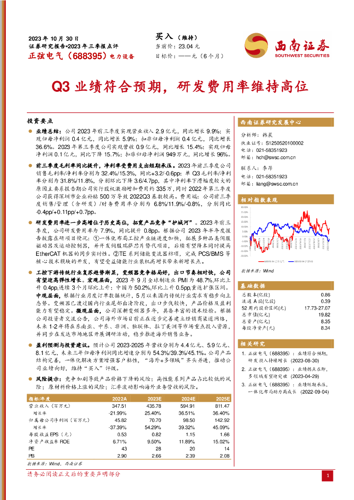 西南证券:正弦电气(688395)-2023年三季报点评:Q3业绩符合预期,研发费用率维持高位.pdf