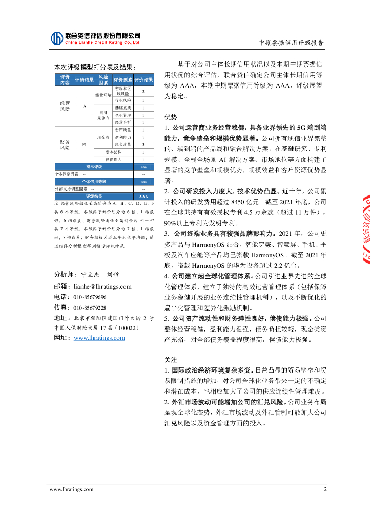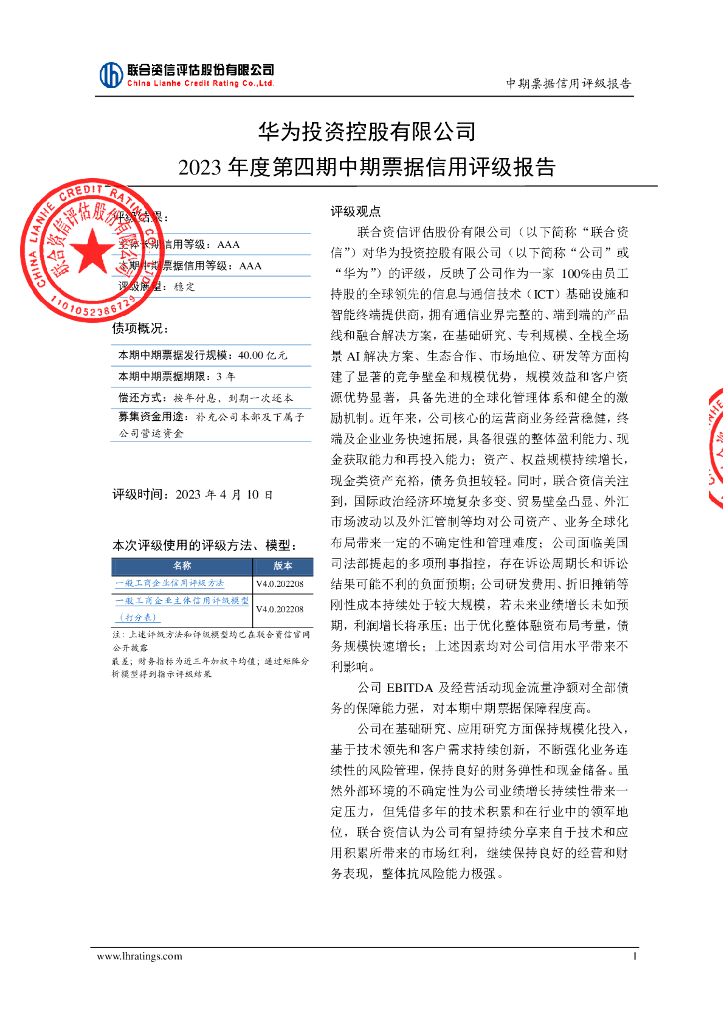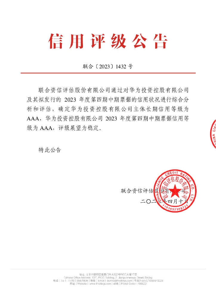 华为投资控股有限公司2023年度第四期中期票据信用评级报告.pdf