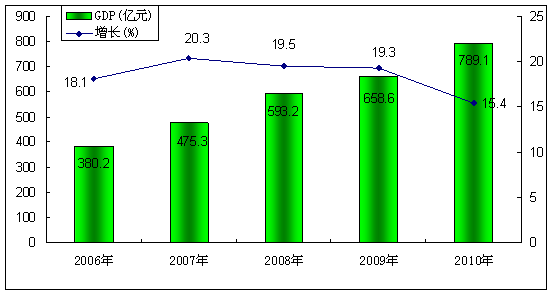 据初步核算,全年实现地区生产总值789.1亿元,按可比价格计算比上年增长15.4%。其中,第一产业实现增加值211.1 亿元,增长6.7%;第二产业实现增加值338.0亿元,增长23.7%;第三产业实现增加值240亿元,增长12.6%。人均生产总值达23222元,比上年增长19.3%。经济结构调整迈出新步伐,一、二、三产业占生产总值的比重由上年的27.4%:39.6%:33.0%变为今年的26.8%: 42.8%: 30.4%。规模以上工业万元增加值综合能源消耗降低16.5%。