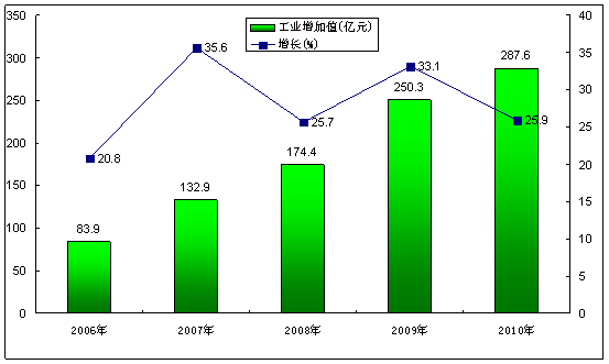工业生产快速增长,生产质量和效益同步提升。2010年,全市规模以上工业实现工业增加值287.6亿元,比上年增长25.9%,其中国有企业实现增加值15.2亿元,增长2.3%;集体企业实现增加值1.5亿元,增长110.3%;股份制企业实现增加值221.6亿元,增长31.6%;外商和港澳台商投资企业实现增加值22.2亿元,增长1.4%。分轻重工业看,轻工业实现增加值101.8亿元,增长16.9%;重工业实现增加值185.8亿元,增长31.6%。