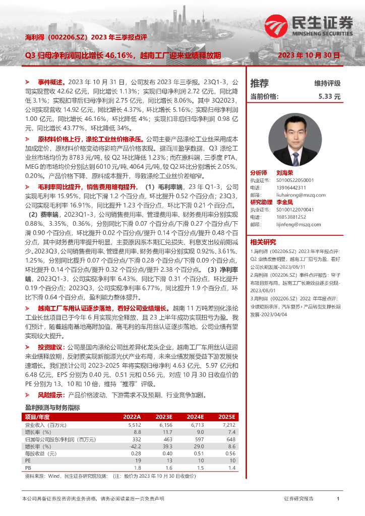 民生证券:海利得(002206)-2023年三季报点评:Q3归母净利润同比增长46.16%,越南工厂迎来业绩释放期.pdf