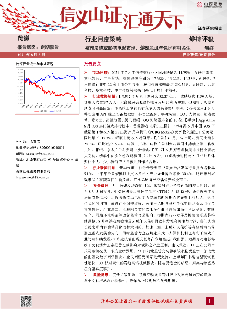 山西证券:传媒行业月度策略:疫情反弹或影响电影市场,游戏未成年保护再引关注.pdf