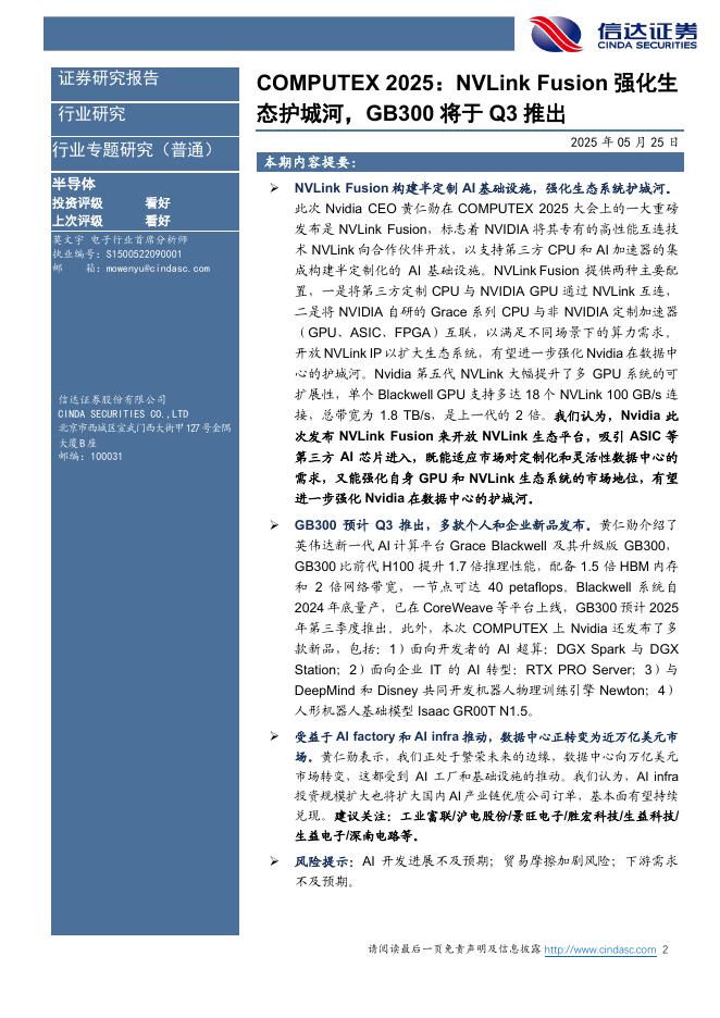 信达证券:COMPUTEX2025:NVLinkFusion强化生态护城河,GB300将于Q3推出.pdf