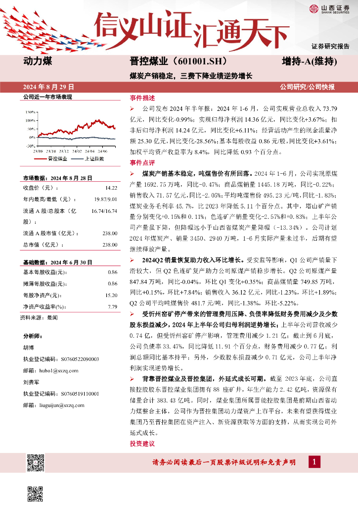 山西证券:晋控煤业(601001)-煤炭产销稳定,三费下降业绩逆势增长.pdf